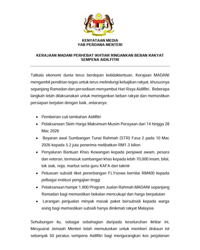 Baca juga: Sekolah Diberi Cuti Tambahan 18 Mac 2026 Sempena Aidilfitri