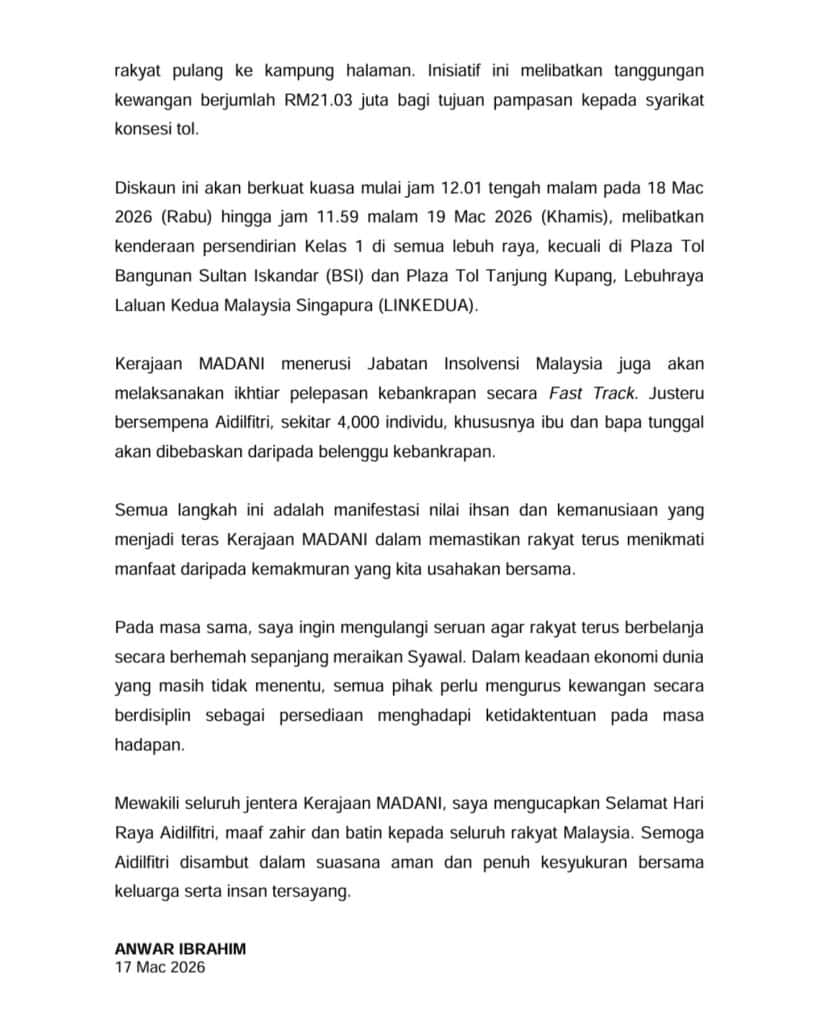 Tempoh pemberian diskaun: Diskaun tol ini sah selama dua (2) hari sahaja, iaitu pada 18 Mac dan 19 Mac 2026.