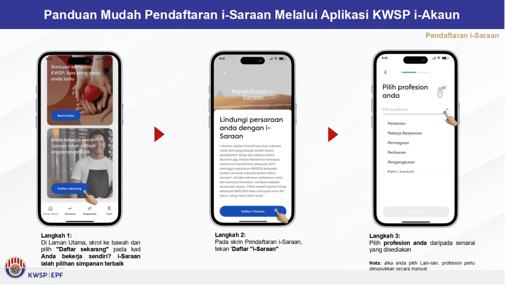 Dapatkan RM500 daripada I-Saraan KWSP sekarang! Individu bekerja sendiri layak menerima bantuan kewangan ini untuk memperkukuh masa depan.