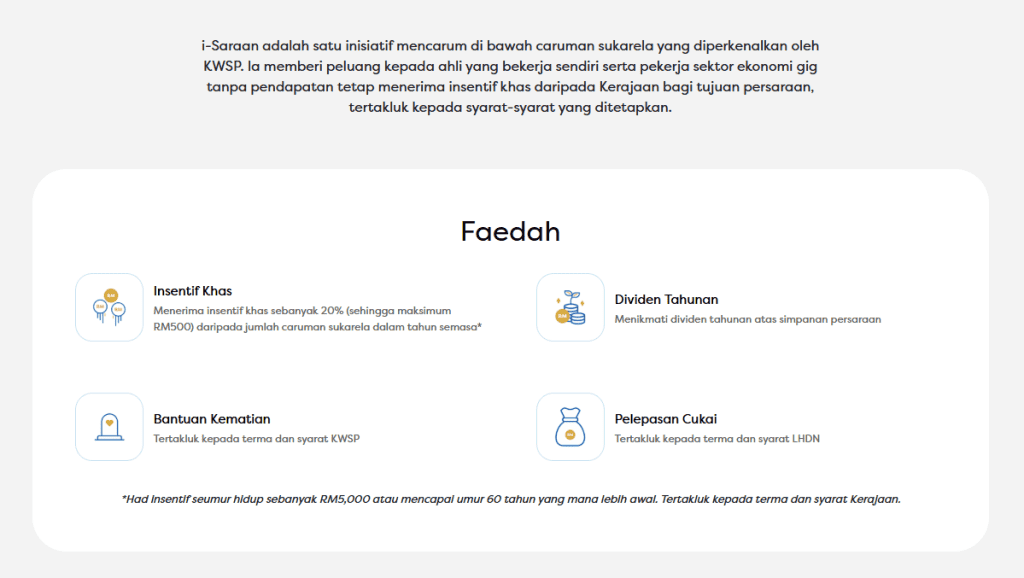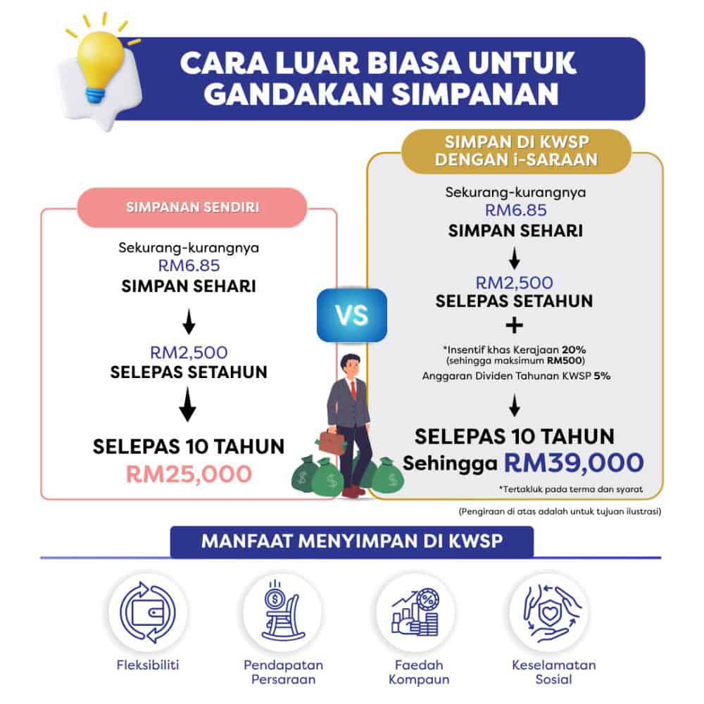 Kerajaan memberikan insentif padanan 20% dari jumlah caruman, dengan had maksimum RM500 setahun dan RM5,000 sepanjang hayat.Bagaimana cara mendaftar untuk i-Saraan KWSP?