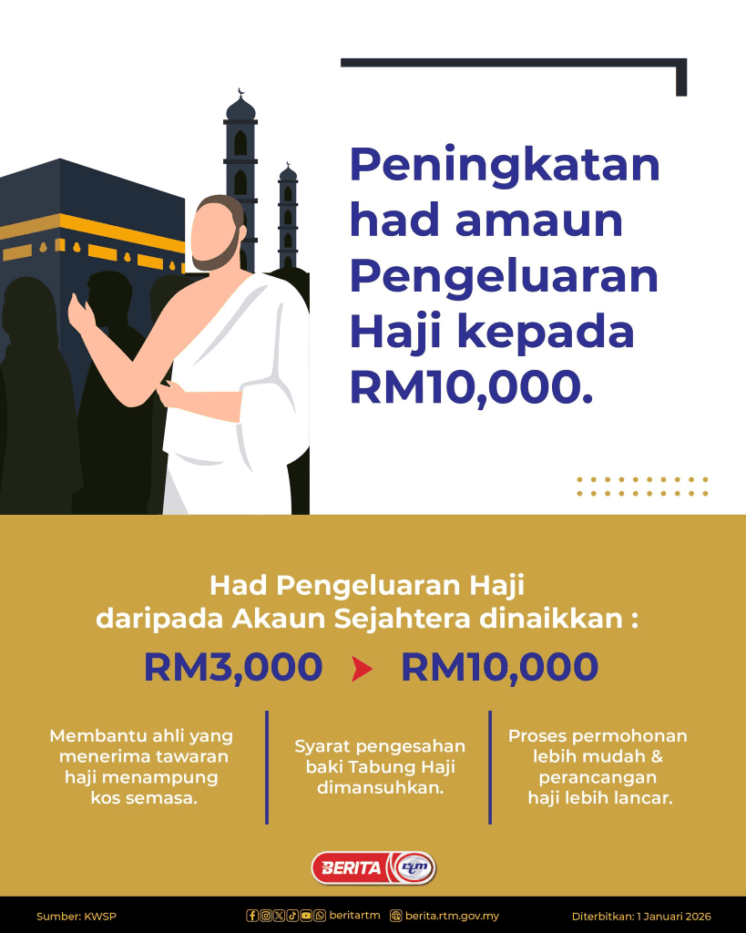Bermula 1 Januari 2026, had maksimum Pengeluaran Haji meningkat daripada RM3,000 kepada RM10,000. Langkah ini mengambil kira kos ibadah haji yang semakin meningkat saban tahun.