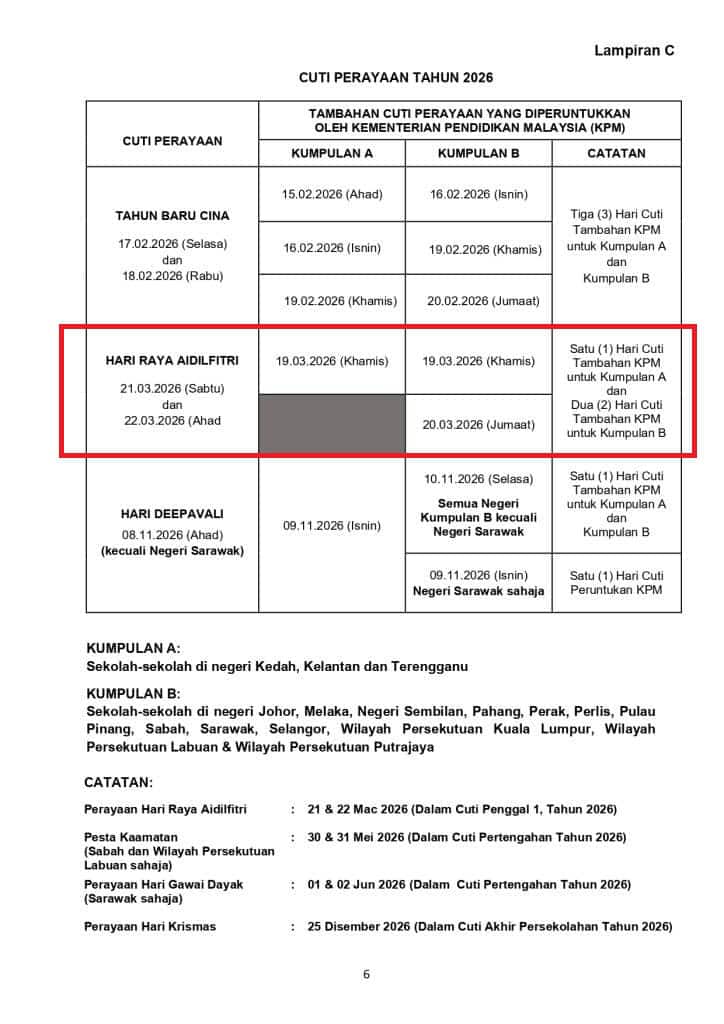 Namun begitu, orang ramai perlu faham bahawa tarikh rasmi Hari Raya Aidilfitri hanya akan diumumkan oleh Penyimpan Mohor Besar Raja-Raja selepas proses cerapan anak bulan. Maklumat di bawah adalah berdasarkan jadual Hari Kelepasan Am Persekutuan 2026 dan Takwim Akademik KPM yang telah diterbitkan secara rasmi.